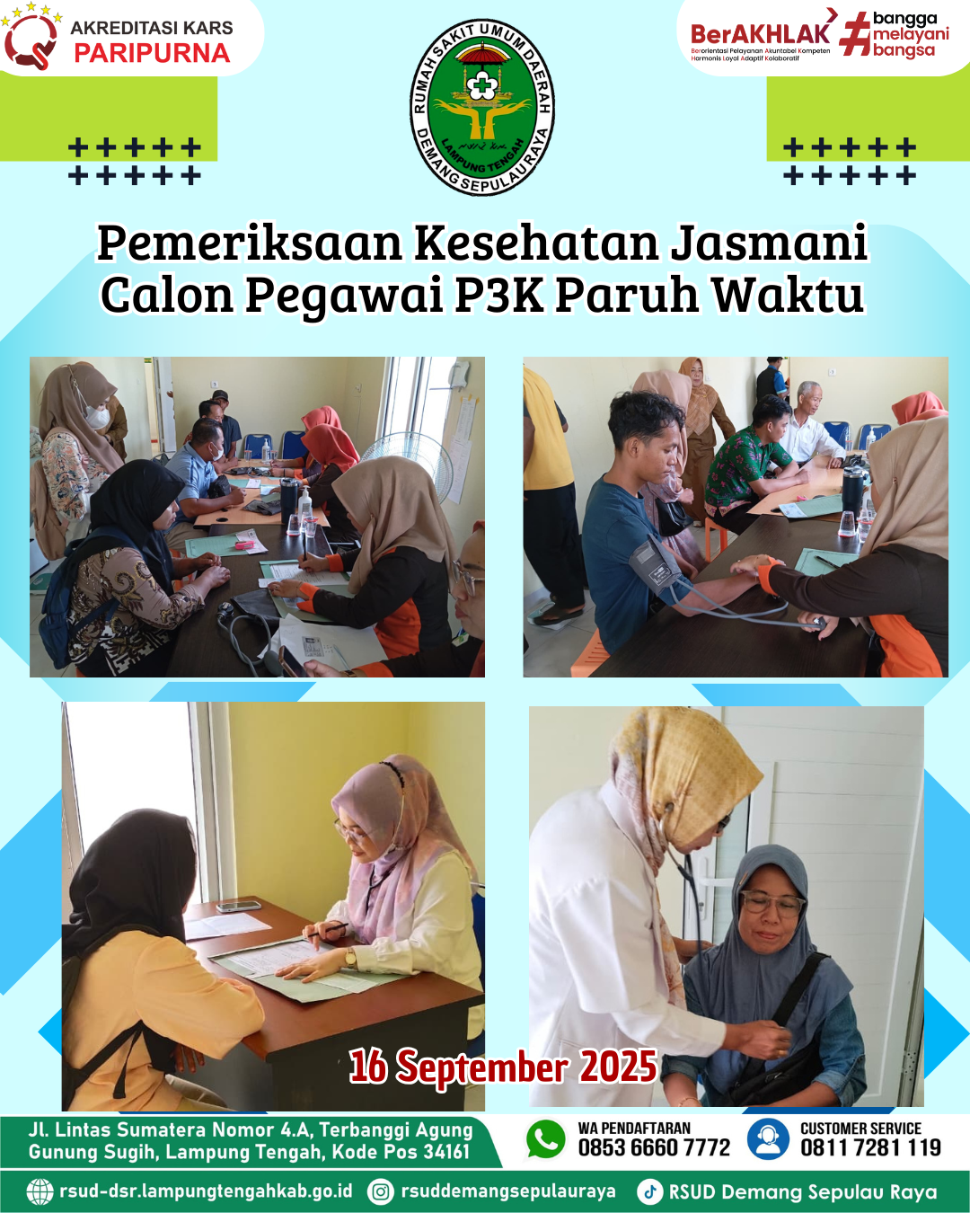 Pelaksanaan pemeriksaan kesehatan ini berjalan dengan lancar dan tertib berkat koordinasi yang baik antara pihak RSUD Demang Sepulau Raya dan panitia seleksi P3K. Diharapkan, hasil dari pemeriksaan ini dapat menjadi salah satu pertimbangan penting dalam menentukan siapa saja yang akan menjadi bagian dari P3K paruh waktu dan berkontribusi dalam pembangunan daerah Lampung Tengah.