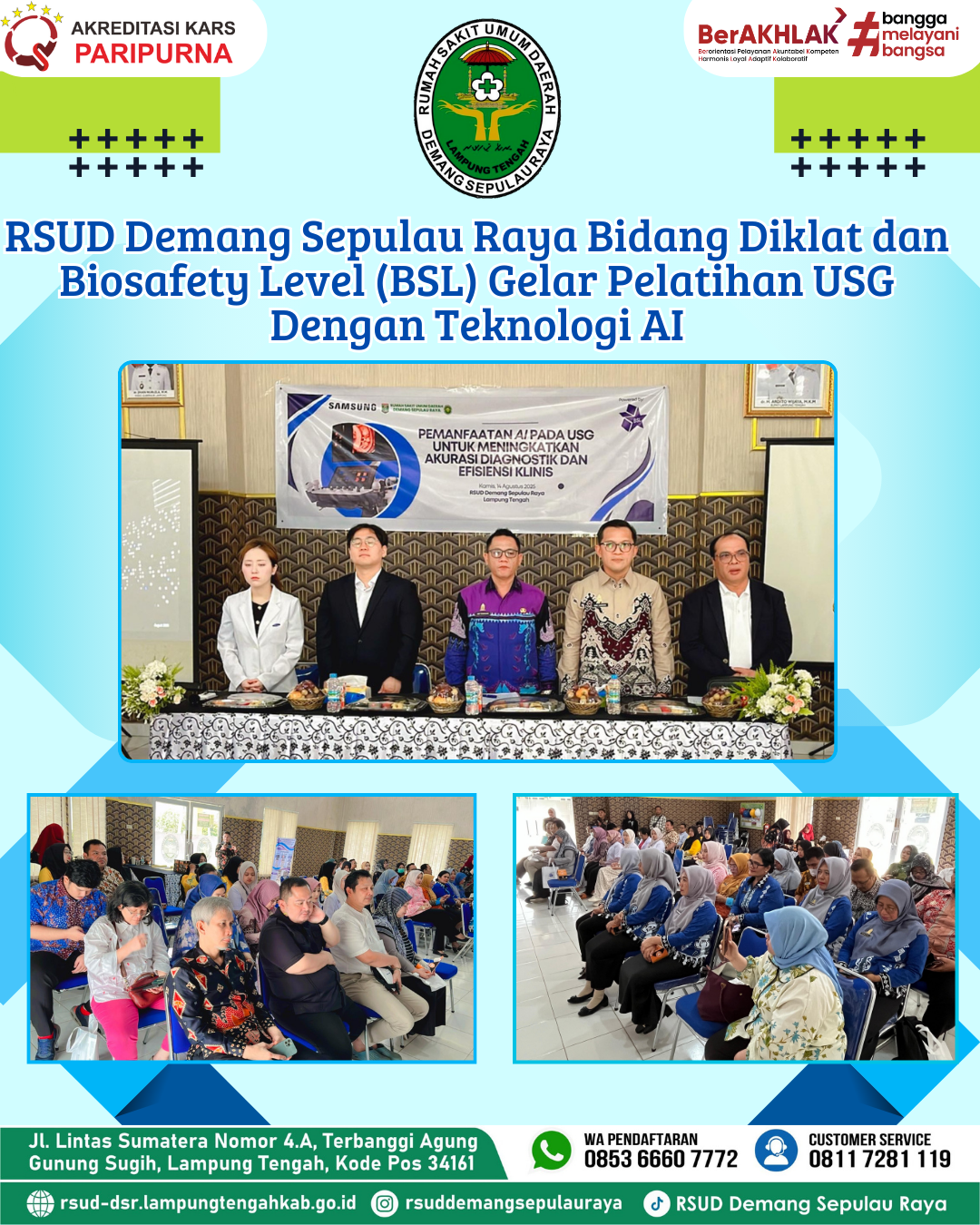 Lampung Tengah, 14 Agustus 2025 – Rumah Sakit Umum Daerah (RSUD) Demang Sepulau Raya dari Bidang Diklat bekerja sama dengan BSL (Biosafety Level) hari ini menyelenggarakan pelatihan alat kesehatan USG (Ultrasonografi) yang bertempat di Aula H. Maryanto. Acara ini menghadirkan Mis.Chae Yeon Een dan Mr.Bryan dari Korean, seorang Clinical Application Specialist dari Samsung, sebagai narasumber utama. Fokus pelatihan kali ini adalah pemanfaatan teknologi kecerdasan buatan (AI) pada USG untuk meningkatkan akurasi diagnostik dan efisiensi klinis.