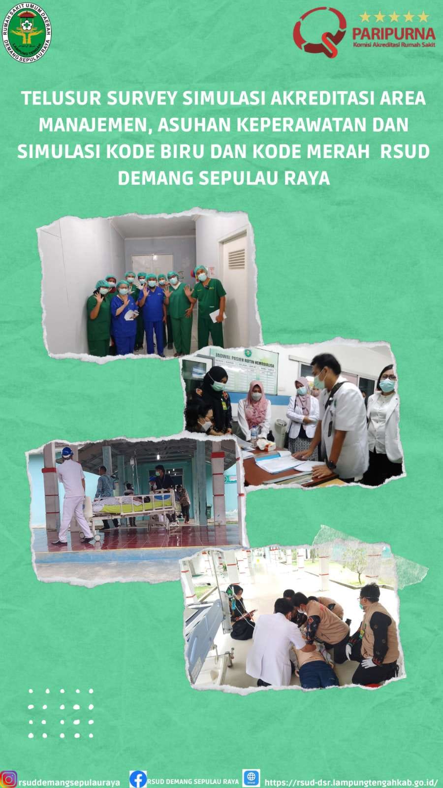Pada hari kamis 8 juni 2023 RSUD Demang Sepulau Raya melakukan telusur di area manajemen, area asuahan keperawatan dan simulasi kode merah dan kode biru pada area rumah sakit demang sepulau raya . simulasi ini di saksikan langsung oleh dr. Desi Kurniawati Direktur RSUD Demang Sepulau Raya dan survaiyor Surevey Akreditasi Rumah Sakit area manajemen Dr. dr. Meliana Zailani, MARS, FISQua dan Area Asuhan Keperawatan Saida Simanjuntak, S.Kp, MARS, FISQua